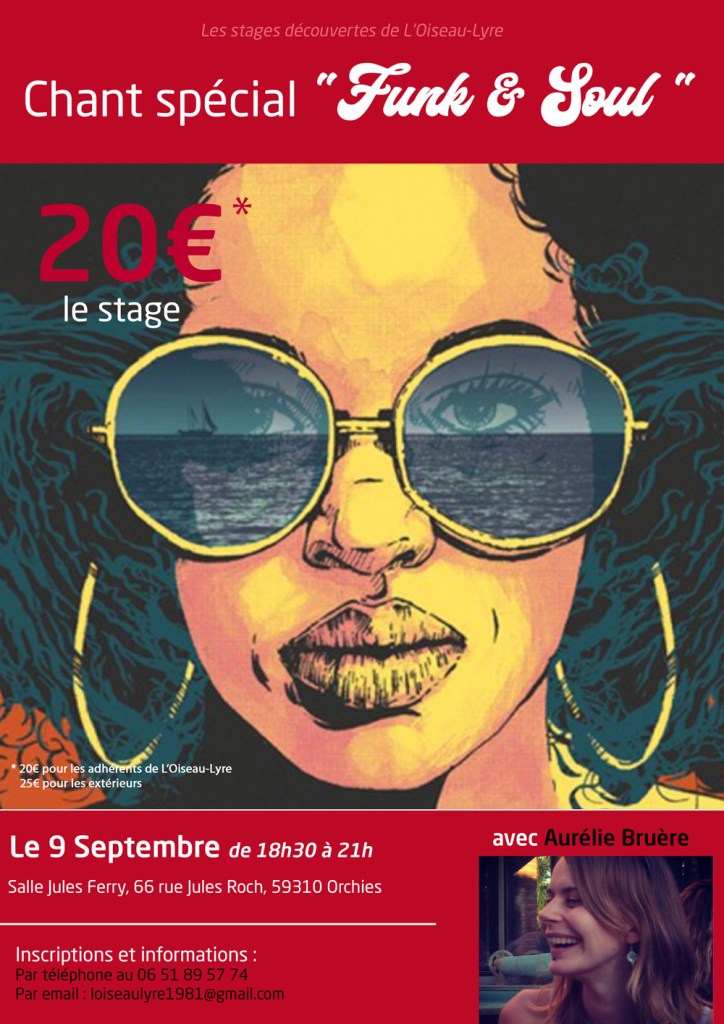 Pour ce stage de chant spécial « funk and soul », nous travaillerons plusieurs extraits de chansons énergiques et groovies avec pour objectif de ressentir le groove dans la musique et de réussir à le transmettre à travers sa voix. Nous travaillerons particulièrement sur les nuances vocales propres à cet univers, à travers des parties solos et des ensembles en harmonies. De quoi faire vibrer tout Orchies !