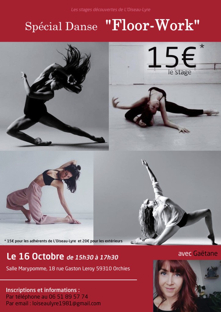 Venez découvrir que le sol est le meilleur ami du danseur ! Tous niveaux à partir de 14 ans. Ce stage est proposé par Gaëtane Longuépée le samedi 16 Octobre de 15h30 à 17h30 à la salle Marypomme (18 rue Gaston Leroy à Orchies).