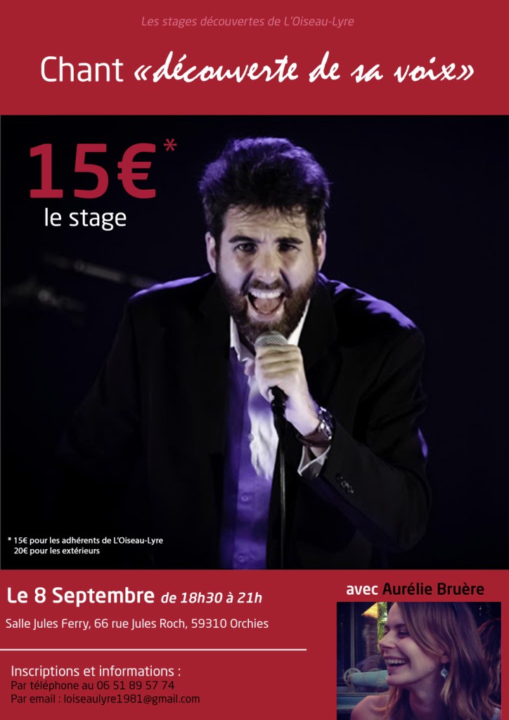 Ce stage « Découverte de sa voix » vous permettra d’aborder les bases du chant, vous aidera à oser franchir le pas, tout en douceur et bienveillance. Il se déroulera le 8 septembre de 18h30 à 21h, 66 rue Jules Roch à Orchies, avec Aurélie Bruère Delcourt.