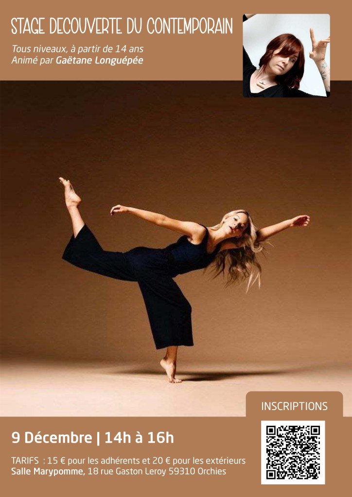Profitez de ce stage de découverte de la danse contemporaine le samedi 9 Décembre de 14h à 16h sur Orchies avec Gaëtane Longuépée.