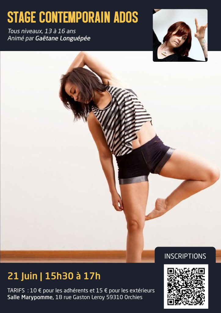 Profitez de ce stage de découverte de danse contemporaine dédié aux ados le samedi 21 Juin de 15h30 à 17h sur Orchies avec Gaëtane Longuépée.