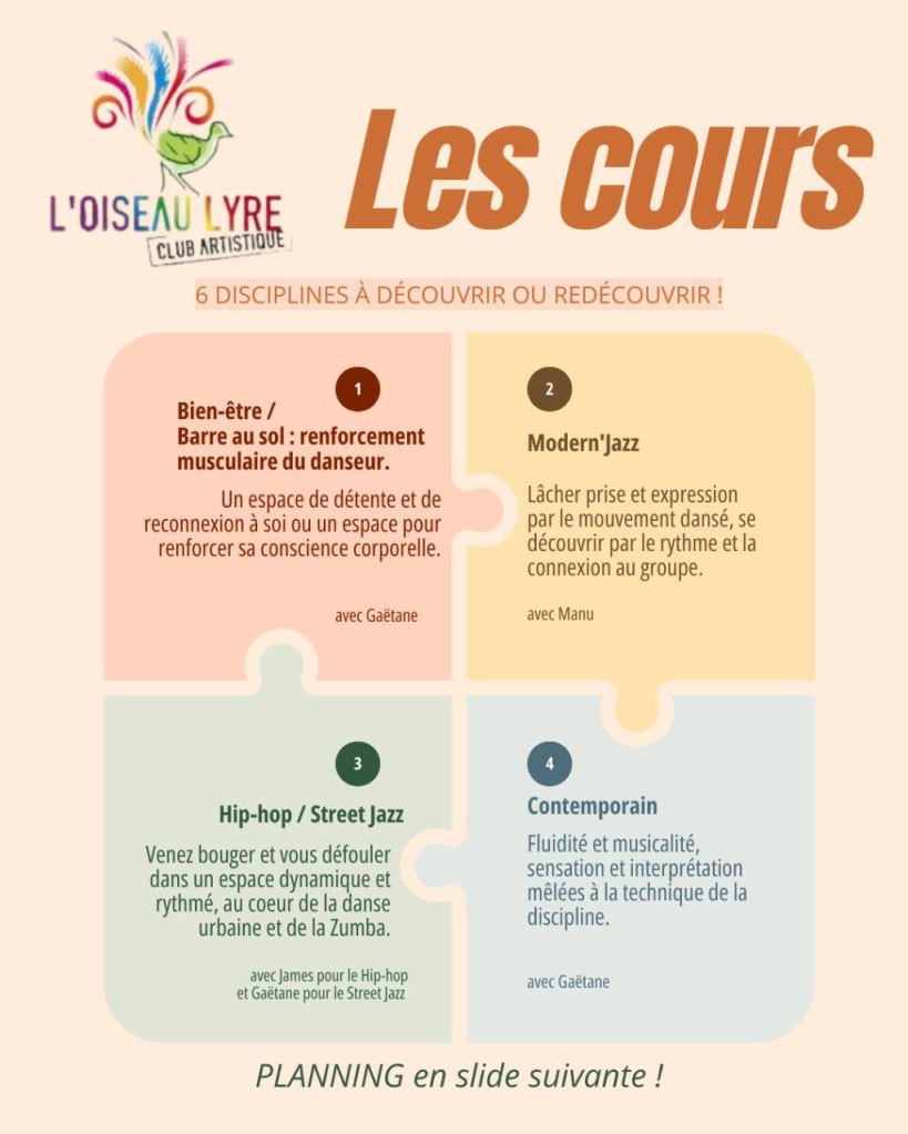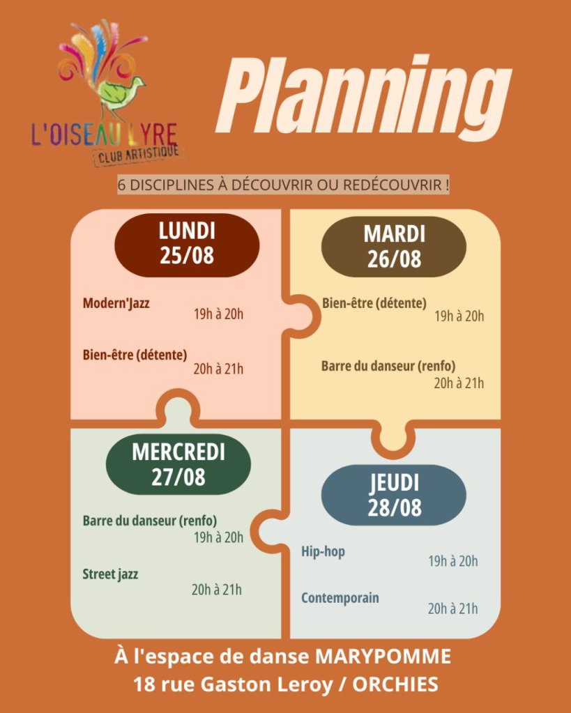 - Lundi 25 août : Modern’Jazz avec Manu + Bien-être (étirements, respiration) avec Gaëtane
