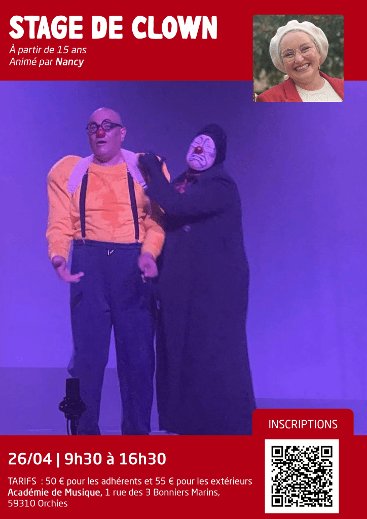 L’Oiseau-Lyre vous propose un stage de dĂ©couverte du clown, Ă partir de 15 ans, le 26 avril 2026 de 9h30 Ă 16h30. C’est le moment pour vous ou vos ados de venir dĂ©couvrir son clown intĂ©rieur. Le stage se dĂ©roulera Ă l’acadĂ©mie de Musique d’Orchies 1 Rue des 3 Bonniers Marins, 59310 Orchies.