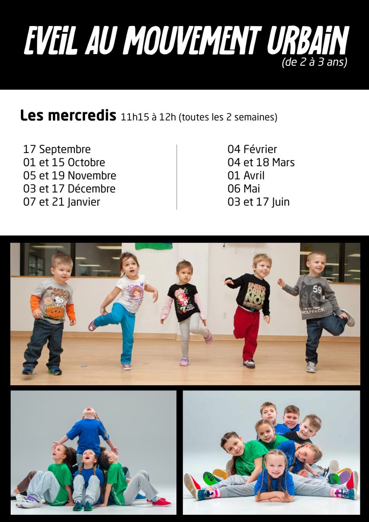 Les séances d’éveil au mouvement urbain sont de 45 minutes, toutes les 2 semaines le mercredi matin :