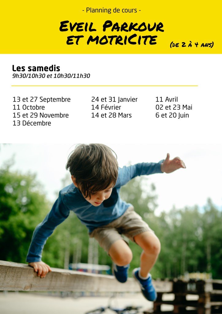 Samedi : 9h30-10h30 : Eveil PARKOUR et Motricité // 2 à 4 ans (2x par mois – voir planning ci-dessous) // 110 € l’année